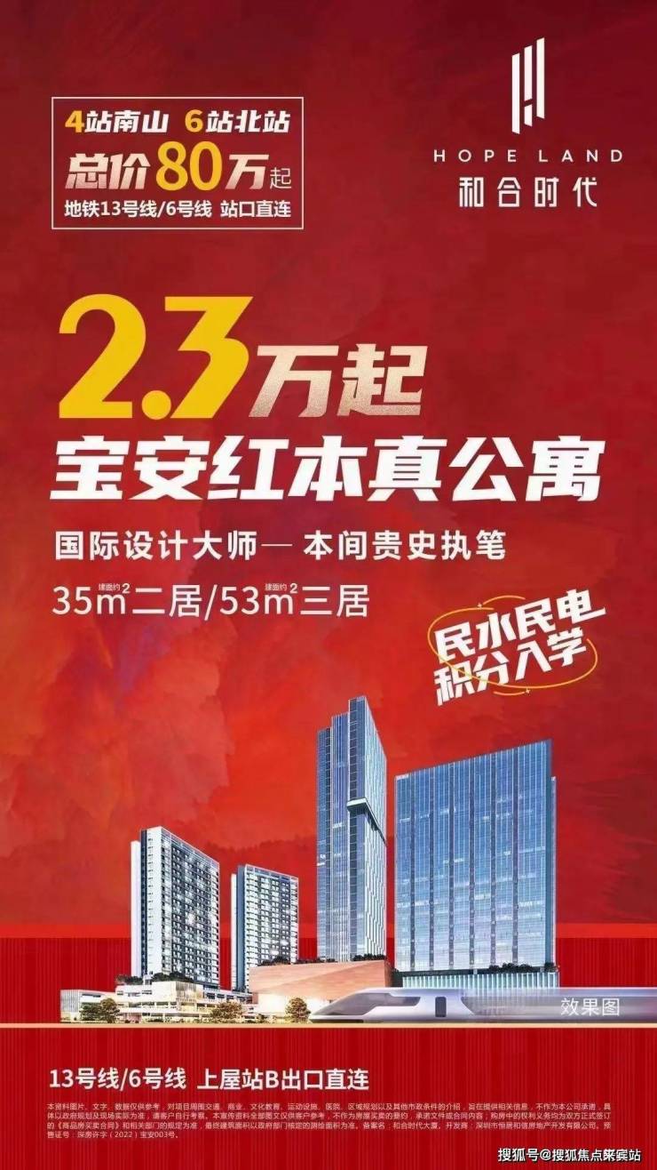 和合时代宝安目前在售公寓最低单价,仅2.3万起,总价80万起买精装两房!!真公寓、通燃气、带阳台、可积分上学、精装交付层高:3.6米,35㎡两房 折后约80-110万,53㎡ 三房折后约140-180万,项目楼下就是双地铁口6和13号线的交汇处,13号线地铁5站抵达留仙洞总部基地,6站西丽高铁站,7站南山科技园,12站深圳湾超级总部基地。深圳和合时代开发商售楼处电话:400-166-9557售楼中心。