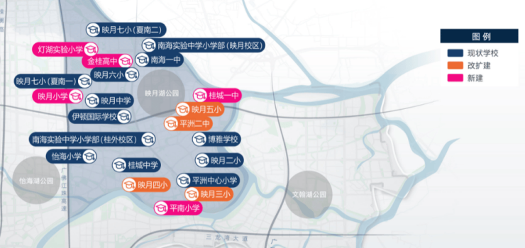未来5年教育投入100亿元,20个新建/扩建学校,新增近1万学位,全龄优质教育资源环绕。周边有平洲中心小学(市一级),桂城外国语学校、南海实验中学映月校区等(省一级)以及映月五小,平洲二中、桂城一中、南海外国语学校等。