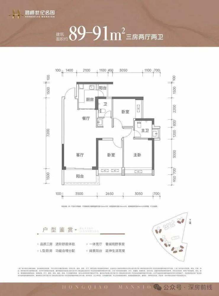 89㎡的3房2厅2卫:经典竖厅格局,客厅3.5米开间,LDKB一体化设计,3个卧室分别做到了3.05米/2.65米/2.35米的宽度,L型厨房带1个小生活阳台,公卫三段式分离,西北、东北或东南、西南、正南向。