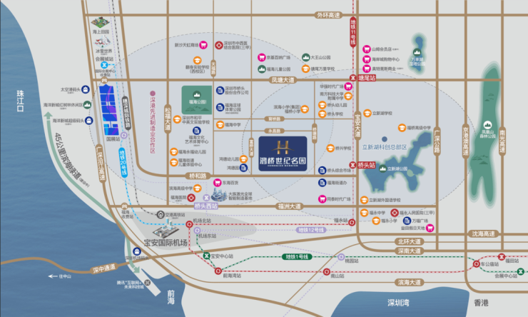 交通配套:项目距离11号地铁线“桥头站”约600米,1站到福永可换乘12号线,3站到机场,5站到宝安,6站到南山前海湾,11站到南山高新园,12号地铁线“福海西站”约1.5公里,还有穗莞深城”福海西站“,该线路于2019年12月15日已建成开通运营。