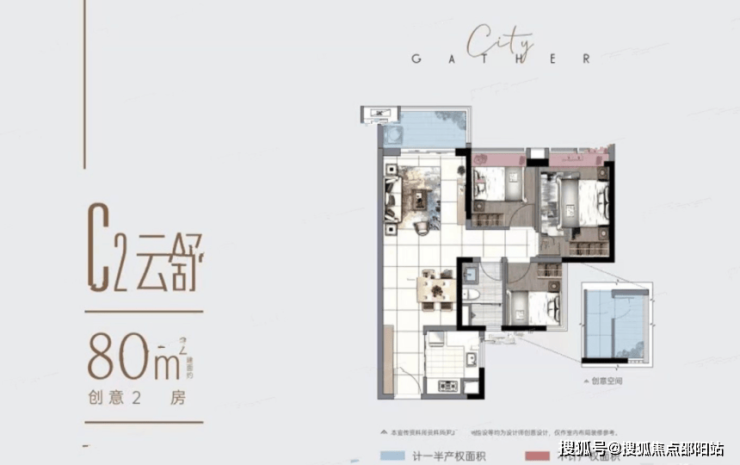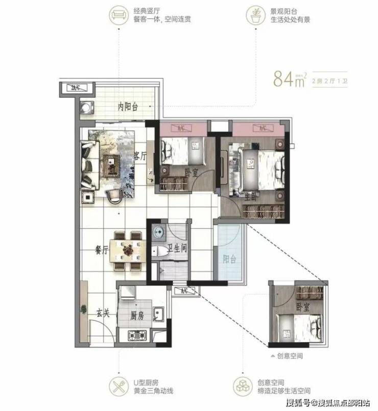 80 平方米 2+1 房为竖厅布局,U 型厨房操作动线较合理,但次卧开窗正对连廊,采光和隐私性会受一定影响;