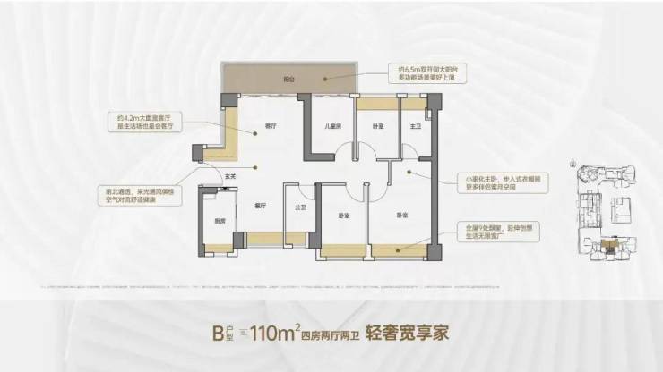 110㎡4房2卫,竖厅南北通透格局,客厅开间4.2米,次卧出6.5米长的大阳台,主卧大套间设计,全屋9处飘窗,阳台主朝北向。
