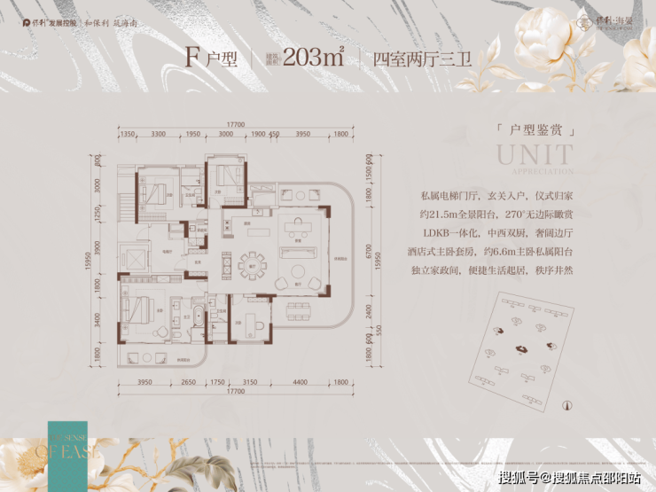 尊享电梯入户,独立玄关,尊崇礼序。南向约 15.2m 阳台,巨阳台视野。LDKB 奢阔方厅,餐厨洄游,灵动 X 空间。全景主卧,酒店式套房,高端度假享受。