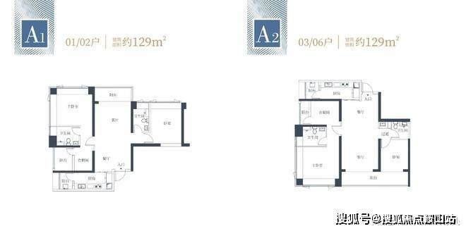 129㎡的3房2厅2卫:有2个户型,分别是西北,东南朝向,都是是双龙抱珠格局,其中A2(03/06)户型客厅超大观景阳台(近7米)舒适大三房设计主卧都享有270度采光面,整体空间尺度感大且采光面充足,视野非常宽阔。