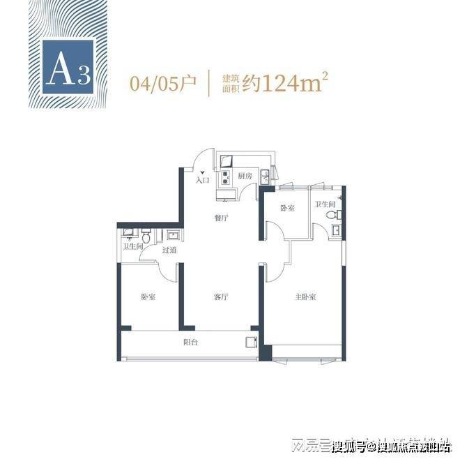 124㎡的3房2厅2卫:设计的是双龙抱珠格局,客厅超大观景阳台,东南朝向,缺点有黑卫,小卧室对天井外走廊采光。