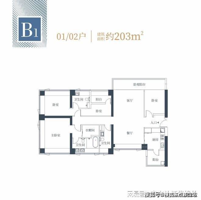 203㎡的4房2厅3卫:私家电梯厅的设置保证了独立的入户空间及体验感、面积6.27㎡。实际得房率在83%,双主卧套房设置且270度景观面,同时主卧带独立衣帽间,竖厅南北通透带7.4米大阳台。