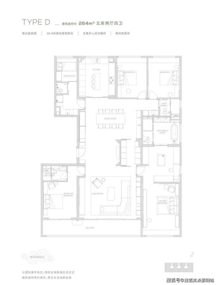 264为五房两厅四卫产品,更细腻的产品设计,超奢华四件套南向主卧,标准南向次主卧, 6.6米巨型方厅,纵向超长LDK一体化空间,专属家政保姆空间,超大容量收纳空间,令居住的尊贵从每处品质细节里流露而出,创造独一无二的奢享体验。