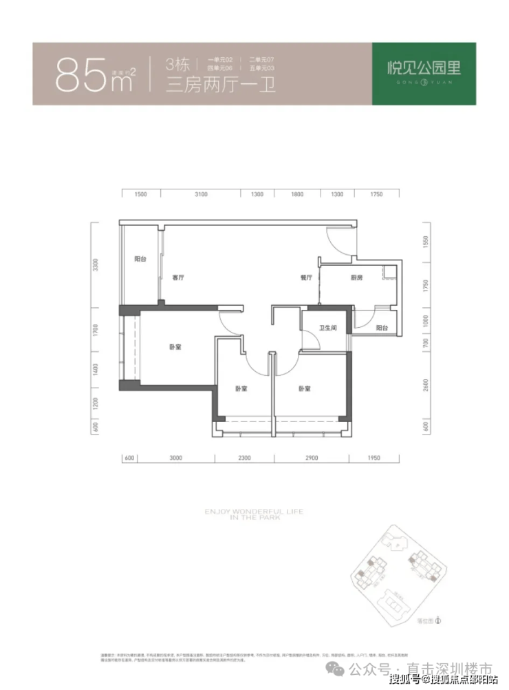 95㎡的3房2厅2卫,仅3栋1单元01户型,设计的是竖厅双龙抱珠格局,客厅3.4米开间,三开间朝南,3个卧室分别做到了主卧11.97㎡/次卧7.47㎡/次卧7.17㎡(实测面积,去掉墙体),L型厨房带1个生活阳台,公卫三段式分离,得房率73.71%(不含赠送),西南朝向。