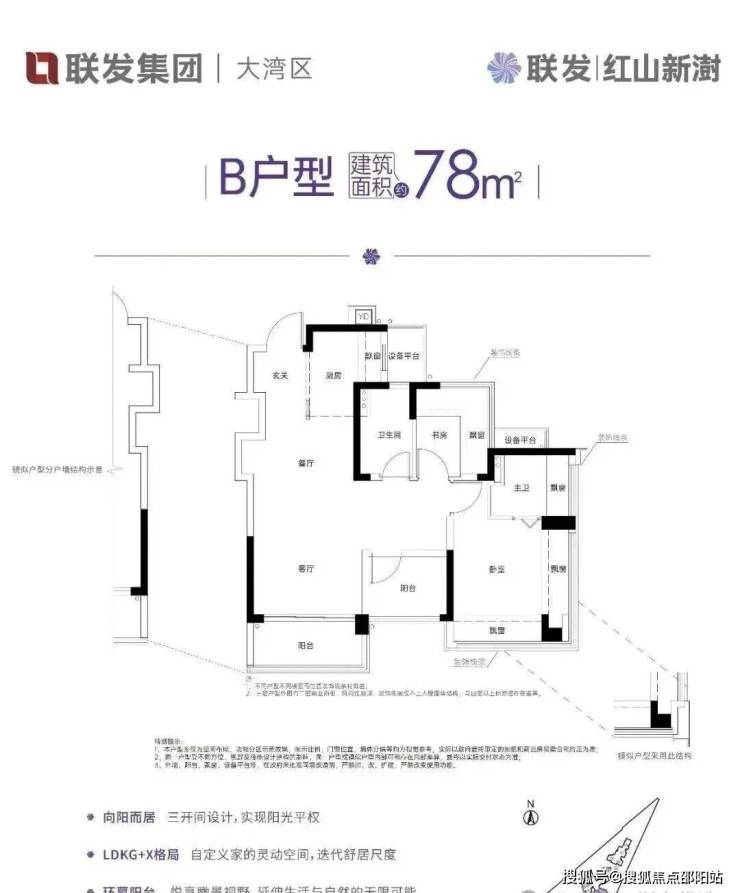 约78㎡的2+1房2厅2卫,设计的是竖厅LDKG+X格局,S墙设计预留冰箱卡槽位,做到了主卧双飘窗,三开间朝南,动静分区,U型大厨房,厨房烟道还做了外置空间,可以更好的利用厨房空间,卫生间三段式干湿分离。赠送了双阳台一半面积+6面飘窗+双设备平台,超100%得房率,东南或西南朝向。这是整个红山板块唯一一个80平以下做到了3房2卫的户型