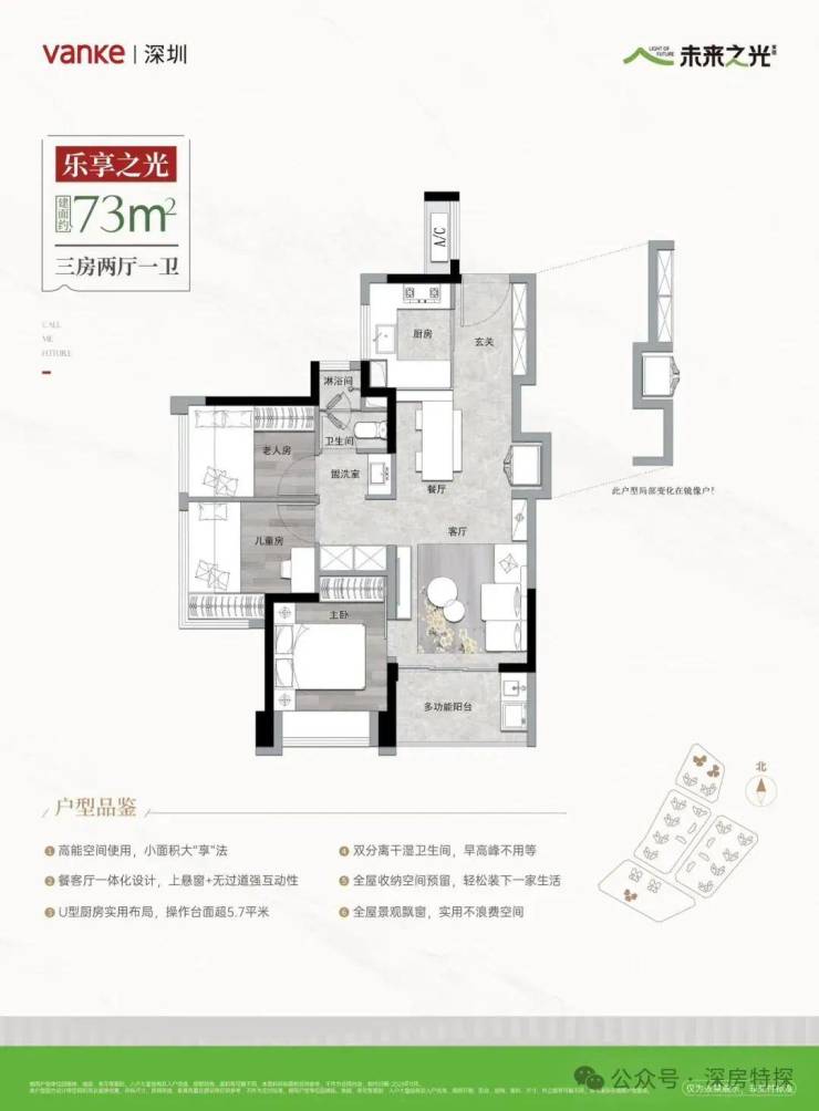 万科未来之光家园,项目共分4个地块开发,占地面积约7.4万㎡,总建筑面积约21.5万㎡,容积率2.91,共由23栋10-23层高住宅组成,配建有1所幼儿园,总规划2466户(商品房1699户,公租房257户,自持租赁住房510户),规划停车位2060个(占比1:0.83)。