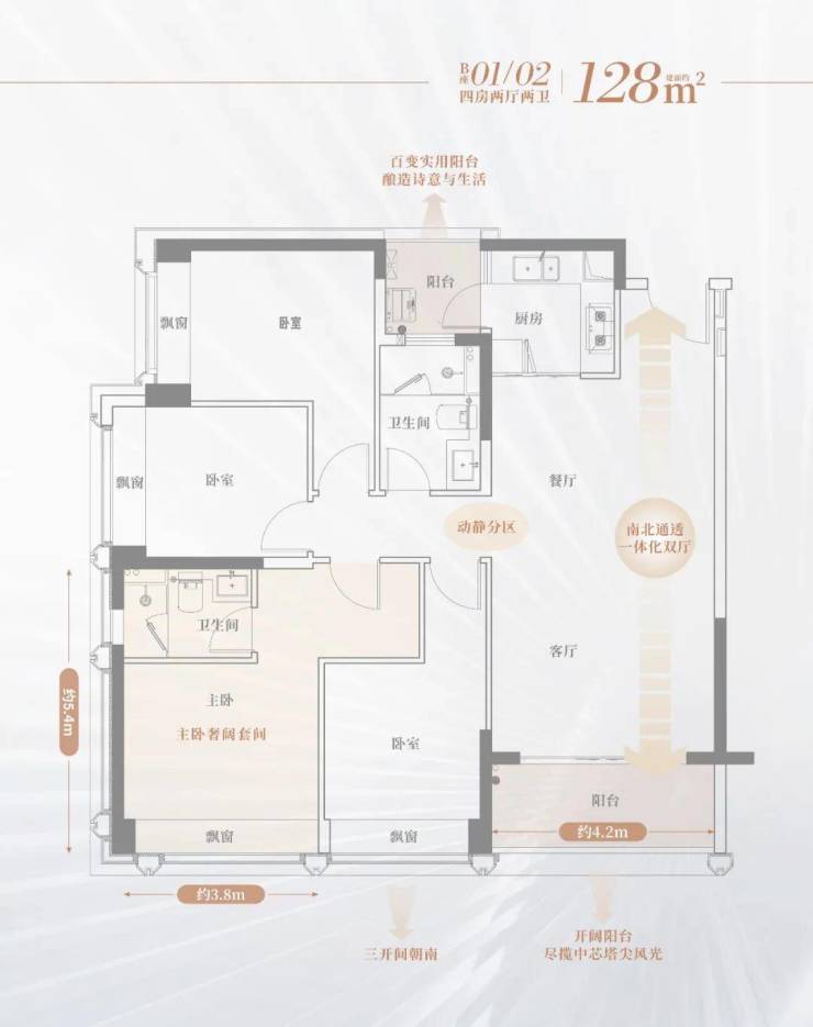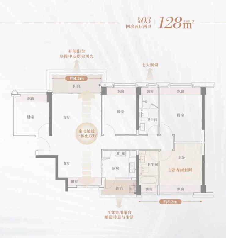 天宸128㎡户型图,双卫浴、双阳台设计,主卧大套房,空间开阔。