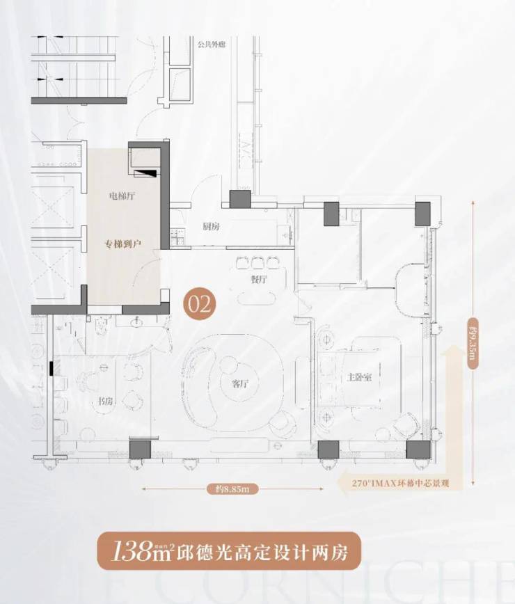 天宸138㎡户型,四梯四户,专梯入户,整个框架可以灵活打造,大面积没有承重墙和承重柱,可以随心设计自己的家。电梯厅加厨房,外部连廊加半个阳台算赠送面积,所以空间利用还算挺高。
