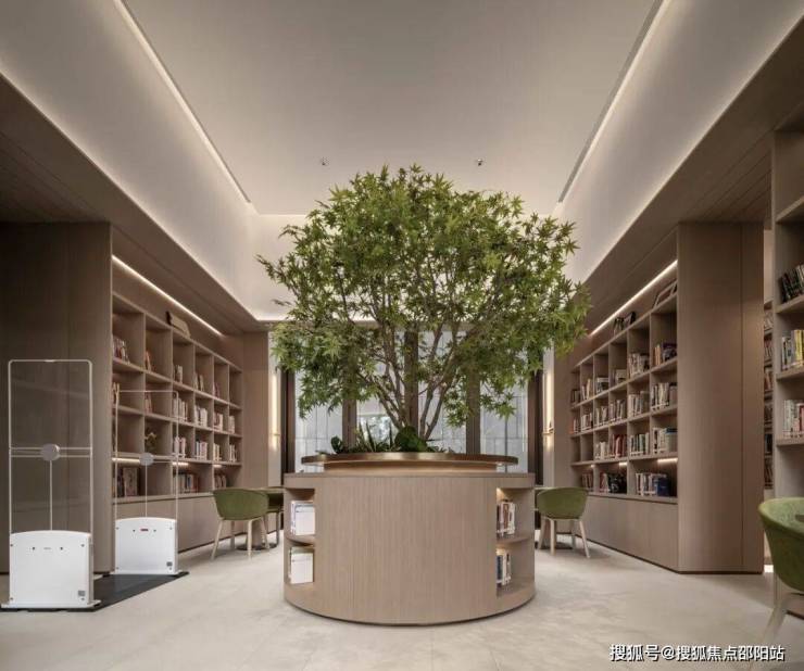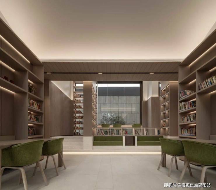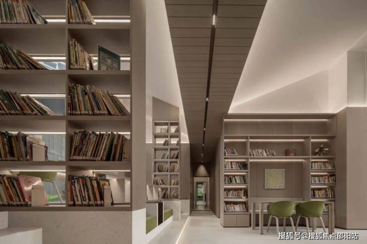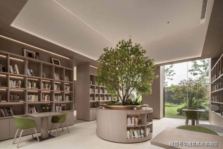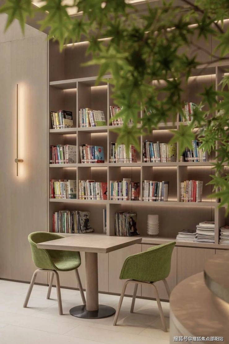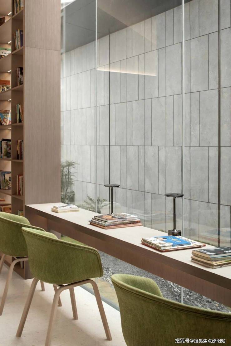通过对阅读行为的体贴考虑,架空层阅读区摒弃装饰性陈设,而是将共生自然的互动伏藏于室。在落地窗景前的书岛栽种一方植境,延展室外绿意,予人净化的心灵感受,让读者由此重拾阅读专注力。