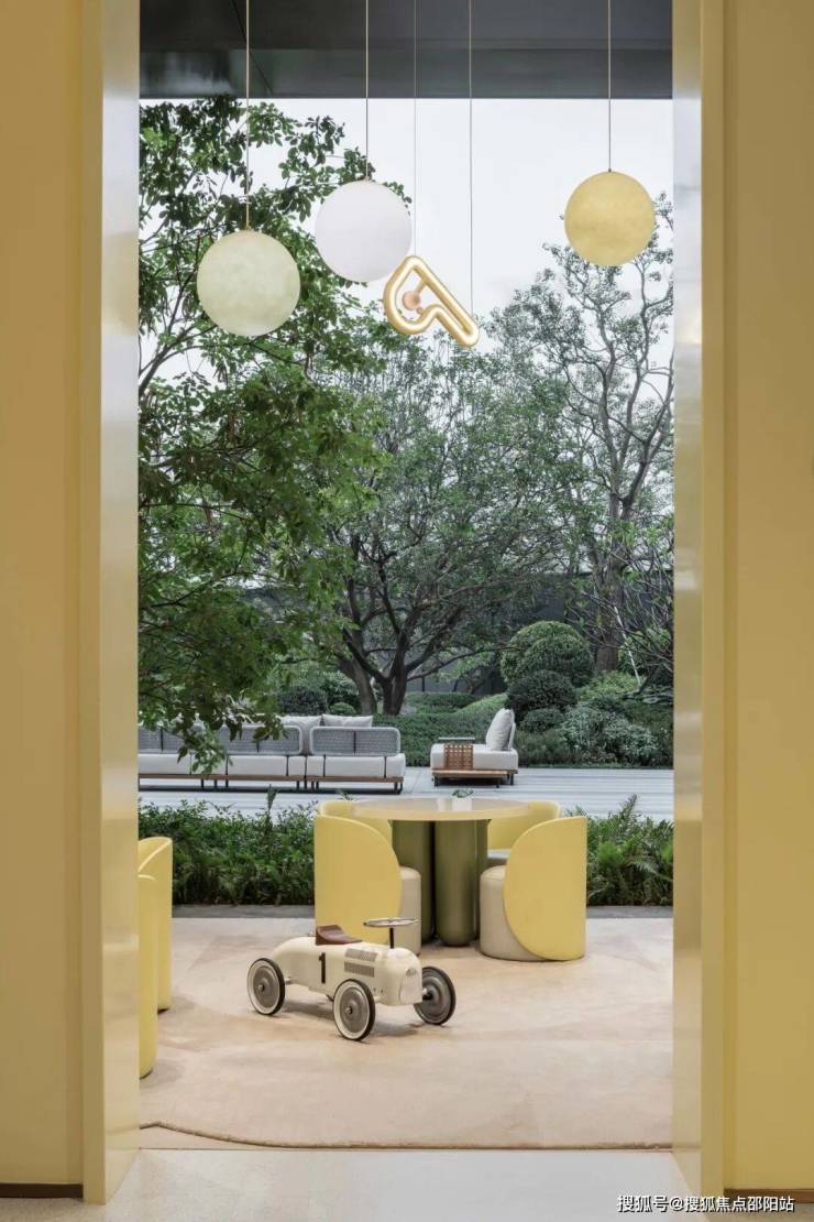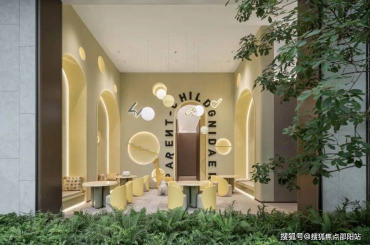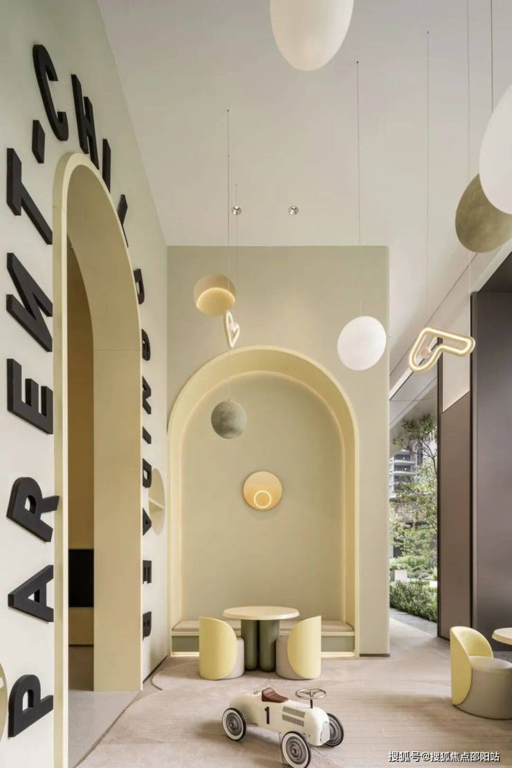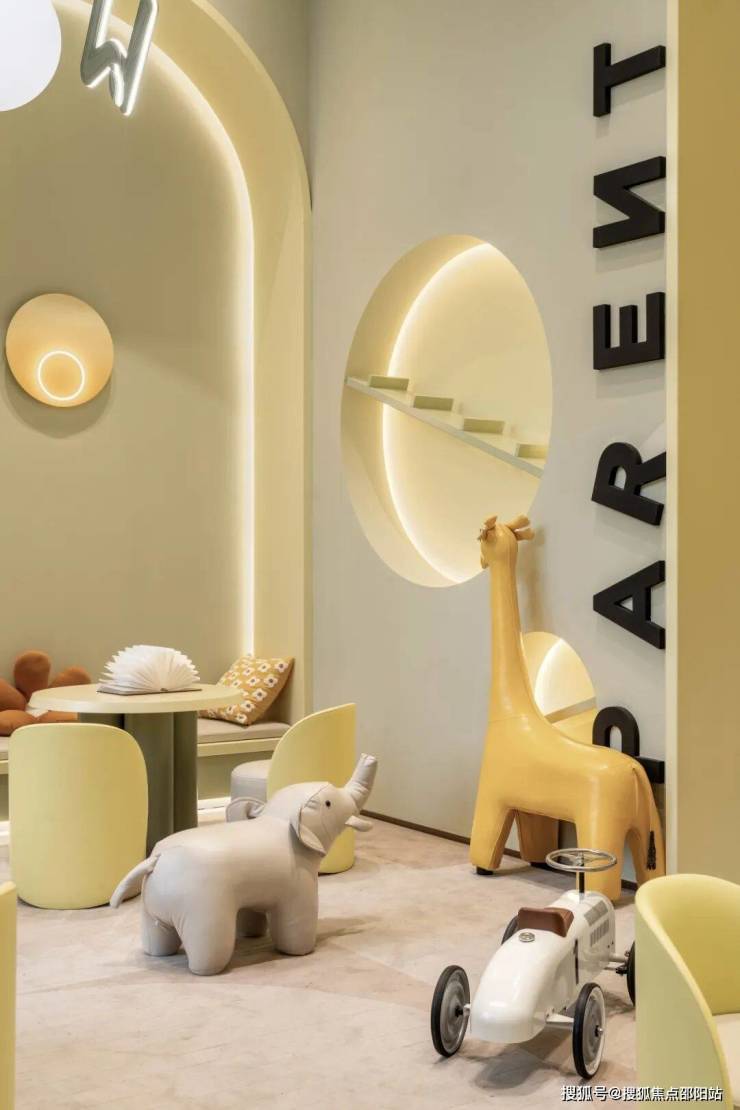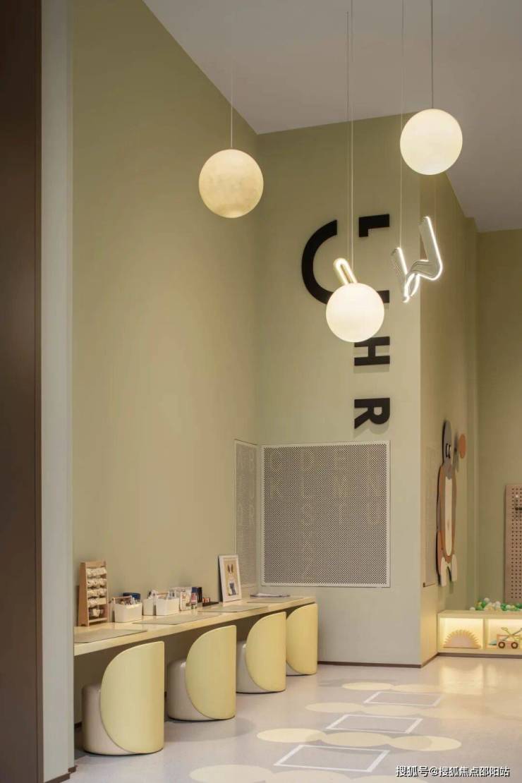 儿童活动区以嫩黄为主色,在视觉上予人跃动感;配合放大的吊饰、艺术字等,充分调动小朋友的观感。