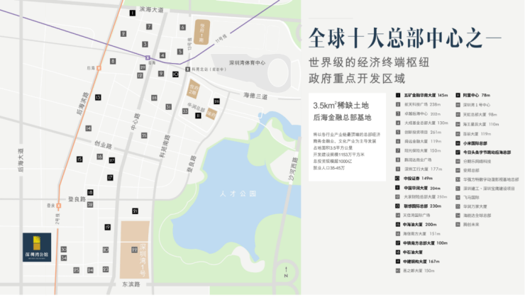 1、区域价值,世界级湾区,后海总部基地,顶级经济聚核:后海金融总部基地与深圳湾超级总部携手,打造以深圳湾为中心,具备全球竞争力的深圳湾超级经济体,其将成为推动深圳超级未来发展的源动力;