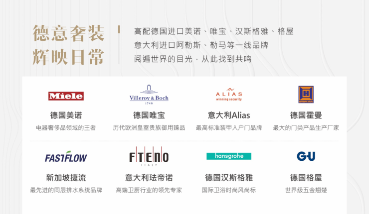 5、品质价值,全球顶级一线品牌精工品质,匠心打造人性化细节:德国Miele、hansgrohe、唯宝;意大利阿勒斯、珐帝诺、LEMA;比利时瑞纳斯;日本大金、百乐满;新加坡捷流等;