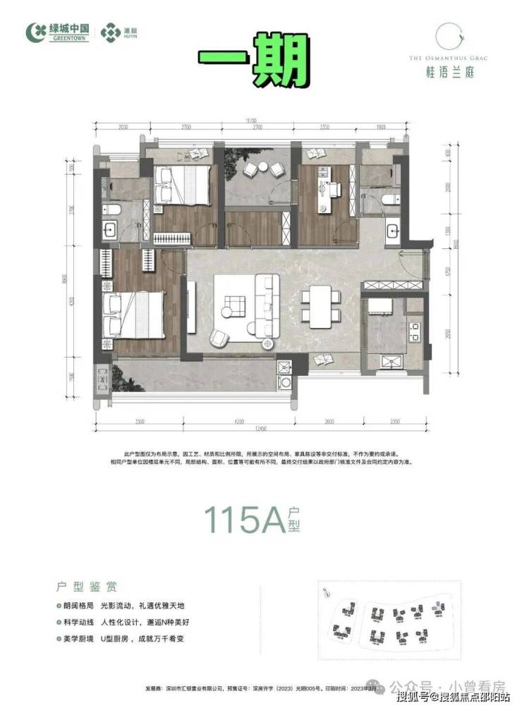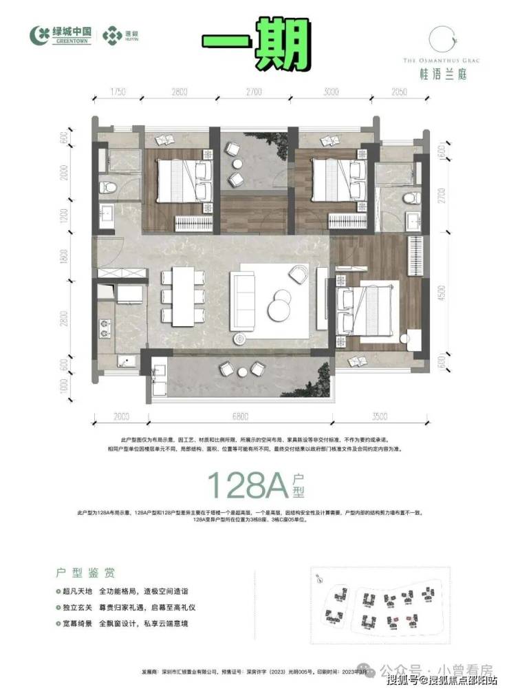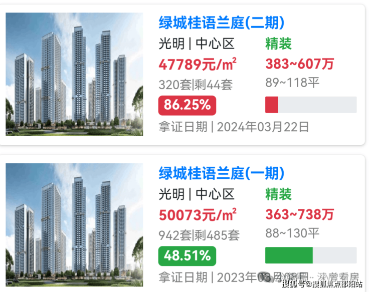 光明中心区,绿城桂语兰庭1期于2023年3月8日首推入市,本次推出3栋A/B/C/D/E座,共942套房源,面积有89㎡的3房2厅2卫,115-128㎡的4房2厅2卫户型,备案均价5万/㎡,备案单价4.07-5.93万/㎡,总价363-738万/套,计划在2025年7月份带精装交房,当时开盘是直接备案价出售。
