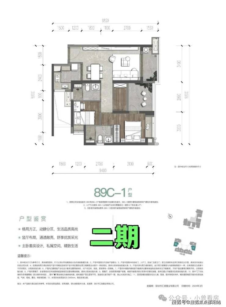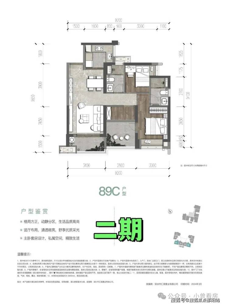 89㎡的3房2厅2卫(二期C户型),设计的是经典竖厅格局,餐客厅一体化,客厅3.4米开间,三开间朝南,3个卧室分别做到了3米/2.8米/2.4米的宽度,U型厨房,阳台1.5米进深,得房率:72.96%(不含赠送),西南朝向。