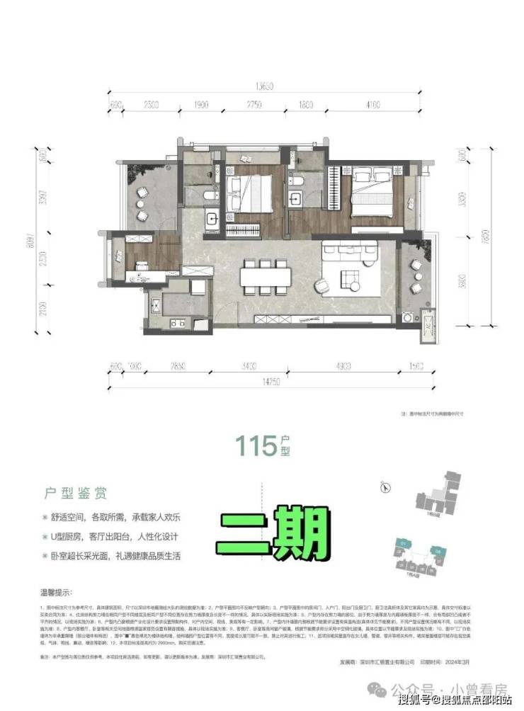 115㎡的4房2厅2卫(二期),设计的是竖厅格局,餐客厅一体化,客厅3.9米开间,4个卧室分别做到了3.3米/2.75米/2.5米/2.3米的宽度,U型厨房,公卫三段式分离设计,阳台1.5米进深,得房率:72.97%(不含赠送),有西北或东南朝向。