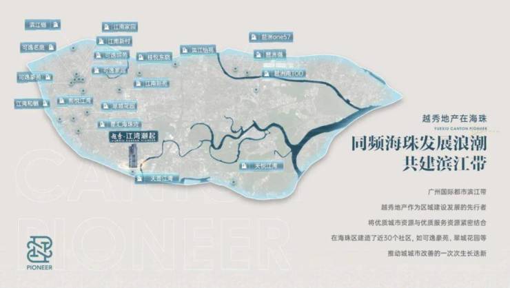 越秀作为区域建设发展的先行者,在海珠区建造了近30个社区,如可逸豪苑、翠城花园等,同时将优质城市资源与优质服务资源紧密结合;以珠江水岸为纽带,沿袭前航道一琶洲段一后航道,布局全新江岸居住生态链。
