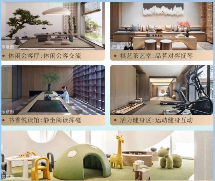 江悅灣打造5大主題架空層泛會所,暢享一個兼具文化與藝術氛圍的鄰里,一個全齡段友鄰交的志趣空間:休閒會客廳(3棟)、棋藝茶藝室(5棟)、書香悅讀館(1棟)、活力健身區(6棟)、童夢歡樂園(6棟)