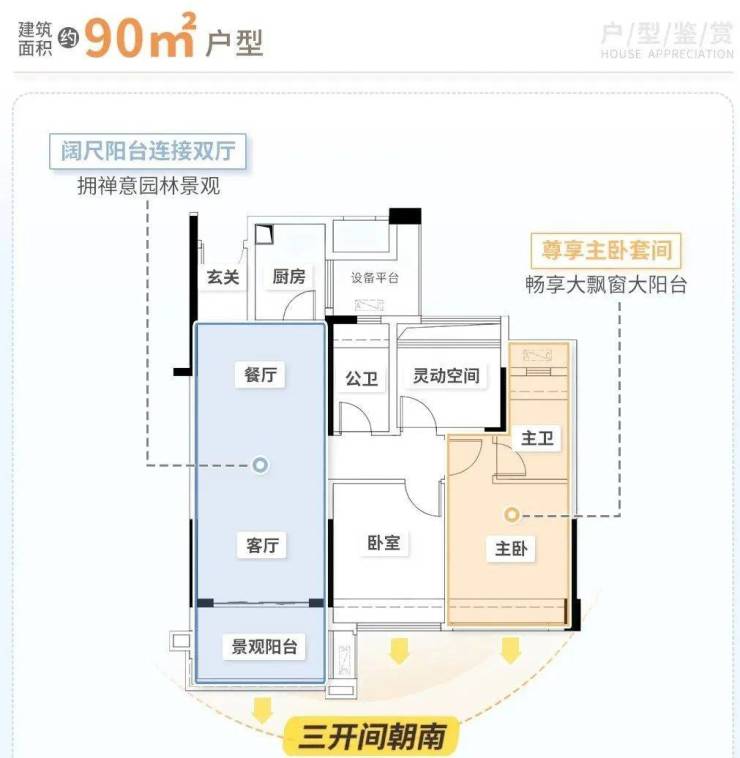 90㎡經典戶型 三開間均朝南 成長家庭優選
