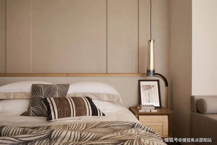 主卧整体的色彩和形制偏向平实,通过硬装细节的打造和软装的灵动来活跃整个空间的氛围调性。