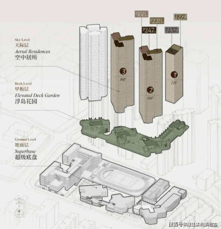 项目住宅设计采用“浮岛甲板”设计策略,四栋住宅落于甲板之上,独享甲板庭院花园。进而形成超级社区底盘+浮岛绿化甲板的垂直共生人居标杆。