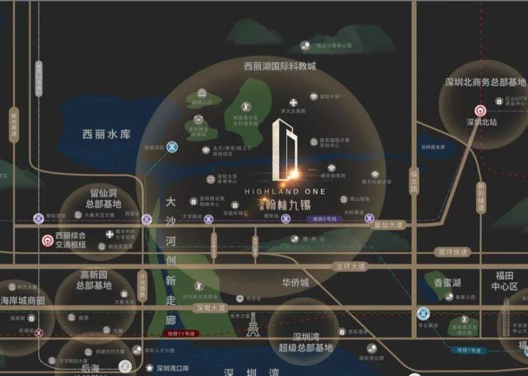 留仙大道正席,紧邻地铁5号线塘朗站,4/5/7号线3轨环绕,毗邻“三纵五横”主干道,瞬息通达全城。西丽高铁站(建设中)、深圳北站两大枢纽环绕,拥有世界交通能级。
