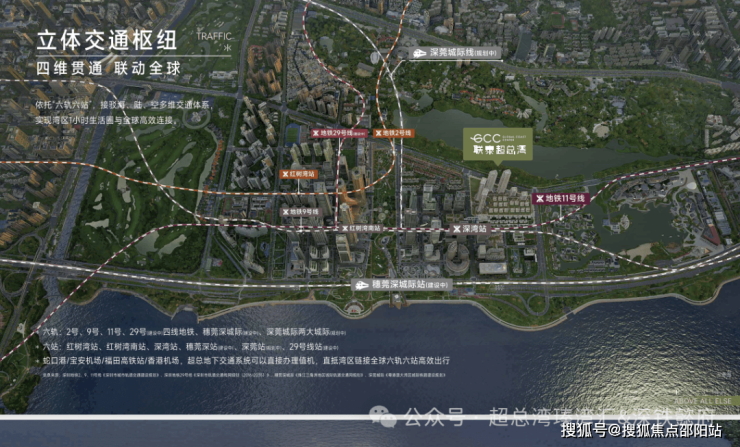 深超总规划"六轨六站"立体交通网络,包括地铁2、9、11号线,规划中的29号线以及穗莞深、深莞城际轨道。TOD模式实现站城一体化,无缝接轨三地铁换乘,引入城市航站楼值机服务,实现10分钟直达深圳湾口岸、20分钟通达前海的城市高效连接。滨海大道综合改造工程打造地下四层立体交通,汇聚城市道路、公交系统和城际铁路,成为大湾区交通核心节点。