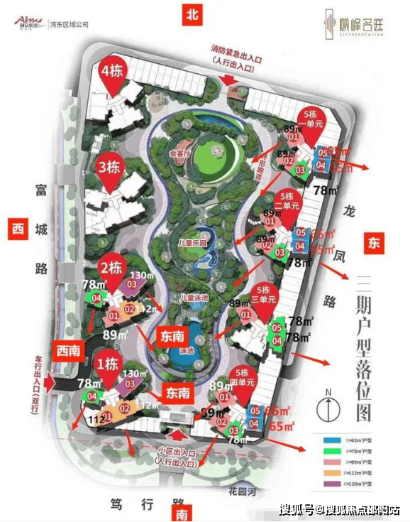 其中1/2/3栋为2梯4户,4/5栋1/2/3/4单元为2梯5户,总规划1110户,车位1010个。