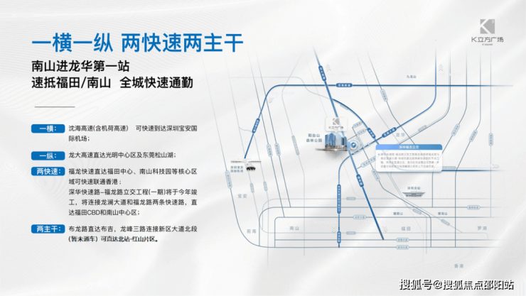 2快速:福龙快速直达福田车公庙,可快速联通香港。深华快速路-福龙路立交工程(一期)将于今年竣工,连接龙澜大道和福龙路两条快速路,未来侨城东路北延线开通后,一站直达南山中心区