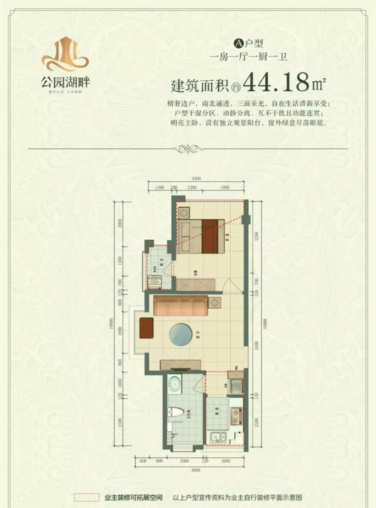 公园湖畔的主打户型,精奢边户,南北通透,三面采光,室内通透明亮。户型动静分区合理,客厅宽敞,L型厨房有效利用空间,卫生间干湿分离,非常适合单身青年居住。
