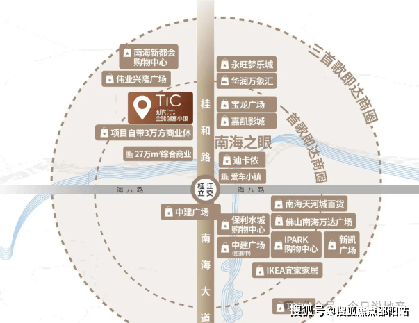 两高速:广佛高速、佛山一环,便捷通达佛山各区域。资源集中:①最多的500强企业及高端人才:毕马威、友邦、招商银行、京东、腾讯等进驻②最高端的商场:永旺梦乐城、南海天河城、保利水城、宜家家私等品牌商业汇聚③最好的生态环境:千灯湖公园、南海全民健身公园、九龙公园汇聚【TIC时代全球创客小镇】①产业:擘画 48 万方高端产业版图,吸引超 200 家企业进驻,贤士俊彦齐聚,共享卓越未来②商业:家门口3万方特色商业街&7.5万方宝龙广场③教育:在家门口坐享 12 年一站式优质教育,自带 2 所 18 班幼儿园、1 所 30 班小学和 1 所 24 班初中④文化:毗邻南海之眼,咫尺 1 院 2 馆 4 中心,地理坐标集聚,领略精神栖居⑤生态:规划1环3公园,每200米有1个公园⑥居住:多元产品线,全面满足人生各阶段需求【TIC创客规划图】
