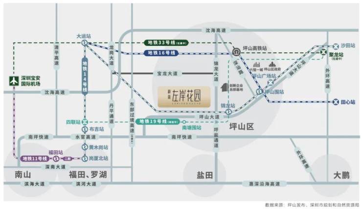 地铁19号线(规划中):坪山首条区内地铁线,项目临近14/19号线换乘站锦龙站,南塘围站。