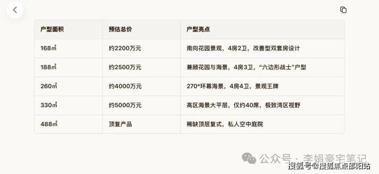 整体定位:纯大户型社区,新规设计,得房率/使用率近100%。户型区间:建面约 140–500㎡ 大平层及顶层复式。