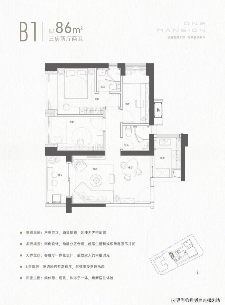建面约86㎡这个户型方正通透,动线明朗,进门后客餐厨阳基本连成一线,大大拉伸了空间感,把约86㎡房子的客厅使用面积做到了约19㎡,至少匹敌市面上一般约100-120㎡户型的客厅空间。高楼层大主卧,还能一览阳台山美景,集休憩、观景、沐浴于一体,私密性极好。