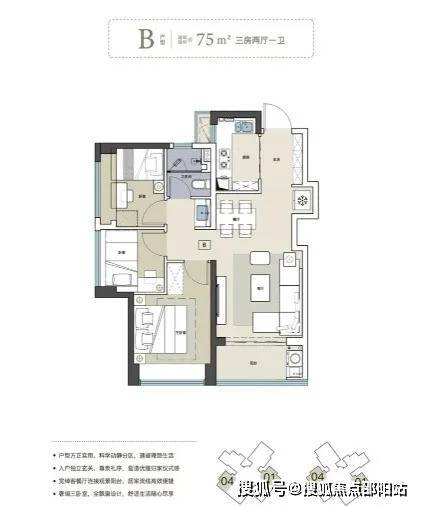 75㎡三房一卫户型:该户型采用LDKB一体化设计,外接南向阳台,主卧带同向飘窗,采光通风佳,空间利用率高。