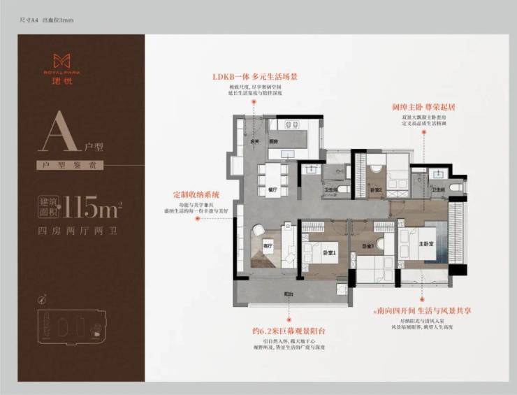 115㎡的4房2厅2卫,A户型(1栋1单元05户型),设计的是经典竖厅格局,进门入户玄关,LDKB一体化,S墙设计预留冰箱卡槽位,四开间朝南,动静分区,主卧双面飘窗,客厅连接次卧出6.2米长的巨幕大阳台,U型厨房,公卫三段式分离,东南朝向,靓点是2个最小的次卧都不用睡飘窗。