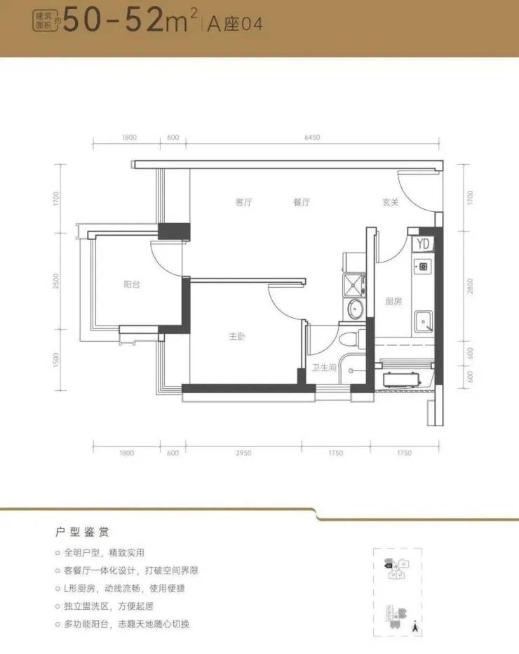 全明户型,精致实用;客餐厅一体化设计,打破空间界限;L形厨房,动线流畅,使用便捷;独立盥洗区,方便起居;多功能阳台,志趣天地随心切换。
