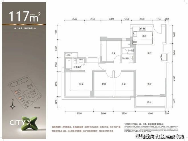 117㎡的4房2厅2卫,1栋2/3单元06户型,设计的是经典竖厅格局,进门入户玄关,客厅4米开间,LDKB一体化,S墙设计预留冰箱卡槽位,四开间朝南,动静分区,4个卧室分别做到了主卧16.5㎡/次卧9.57㎡/次卧8.58㎡/次卧7.97㎡(包含墙体飘窗),U型厨房,公卫三段式分离,得房率约90%(包含赠送),东南或西南朝向。