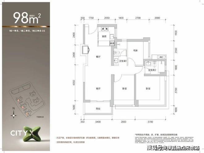 98㎡的3房2厅2卫,1栋1/2/3单元03.05户型,设计的是经典竖厅格局,进门入户玄关,客厅3.4米开间,LDKB一体化,S墙设计预留冰箱卡槽位,三开间朝南,动静分区,3个卧室分别做到了主卧14.3㎡/次卧10.36㎡/次卧6.75㎡(包含墙体飘窗),U型厨房,公卫三段式分离,得房率约90%(包含赠送),东南或西南朝向。