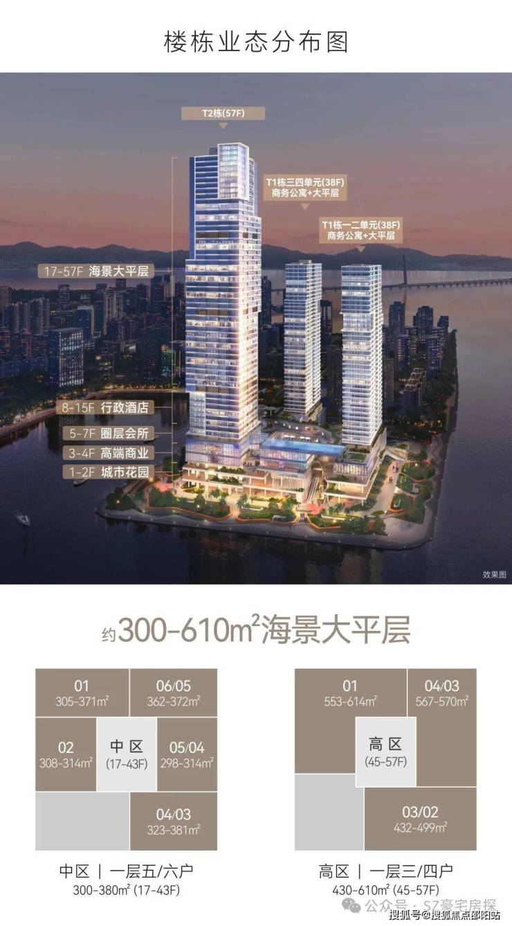 户型面积:230-700平方米,涵盖3-6房大平层,层高3.6-4米。