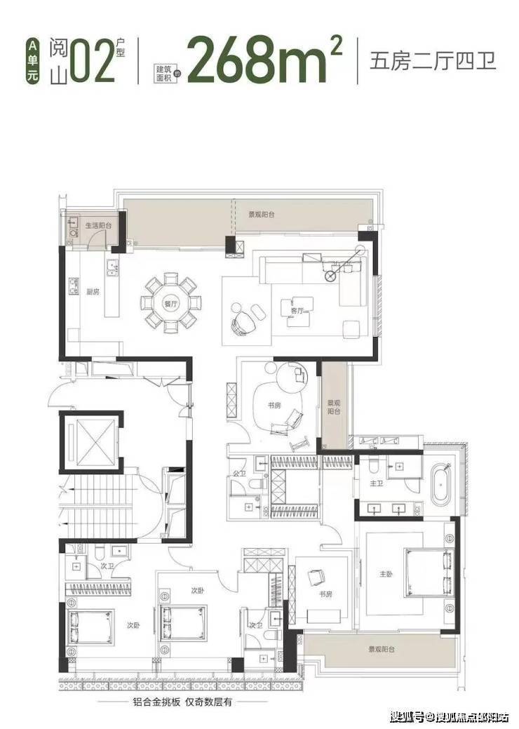 同样的专梯入户,豪宅感扑面而来,该户型为顶级大户型,四阳台设计,最大有10.55米的景观阳台和180度视野的餐客厅空间奢阔气场尽显,罕见的南北瞰景四阳台设计,让家的每个角落都能欣赏美丽的山景和城市景观。所有的开窗面都尽可能放大,客餐厅、书房、卧室、几乎都能享受超宽超大屏