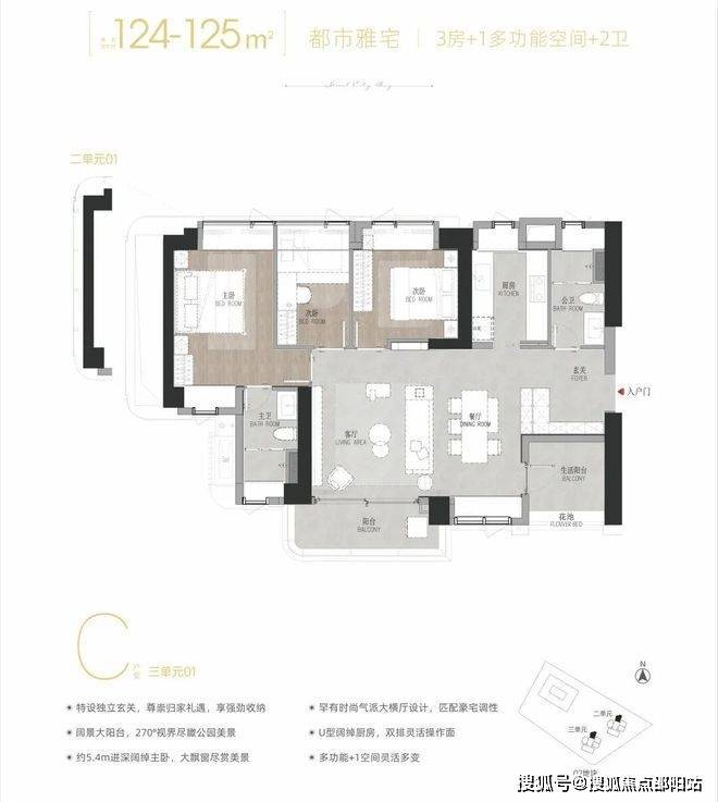 01 C户型——建面约124-125㎡3+1多功能空间:横厅户型,双阳台设计,西北朝向,看向绿地公园及花园。大横厅+通透采光:采用“双厅合一”的大横厅设计,摒弃多余过道,让客餐厅空间感直接拉满。
