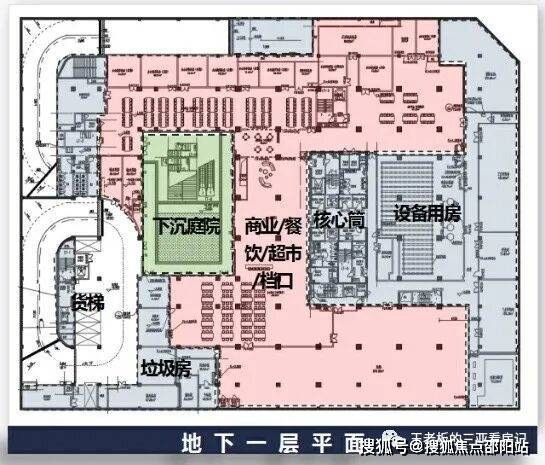 【项目地下一层】独特的下沉式庭院,商业配套/轻重餐饮、超市、美食档口多业态组合大布局开间。