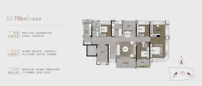 以建面约196平的户型为例,其近7米开间奢阔横厅的设计尺度超过了很多200平以上的豪宅。这种设计使得室内空间更加开阔,同时也增强了空间的通透感和采光效果。搭配LDKG一体化设计,餐客厨空间接近60平,为住户提供了宽敞舒适的餐饮和娱乐空间。
