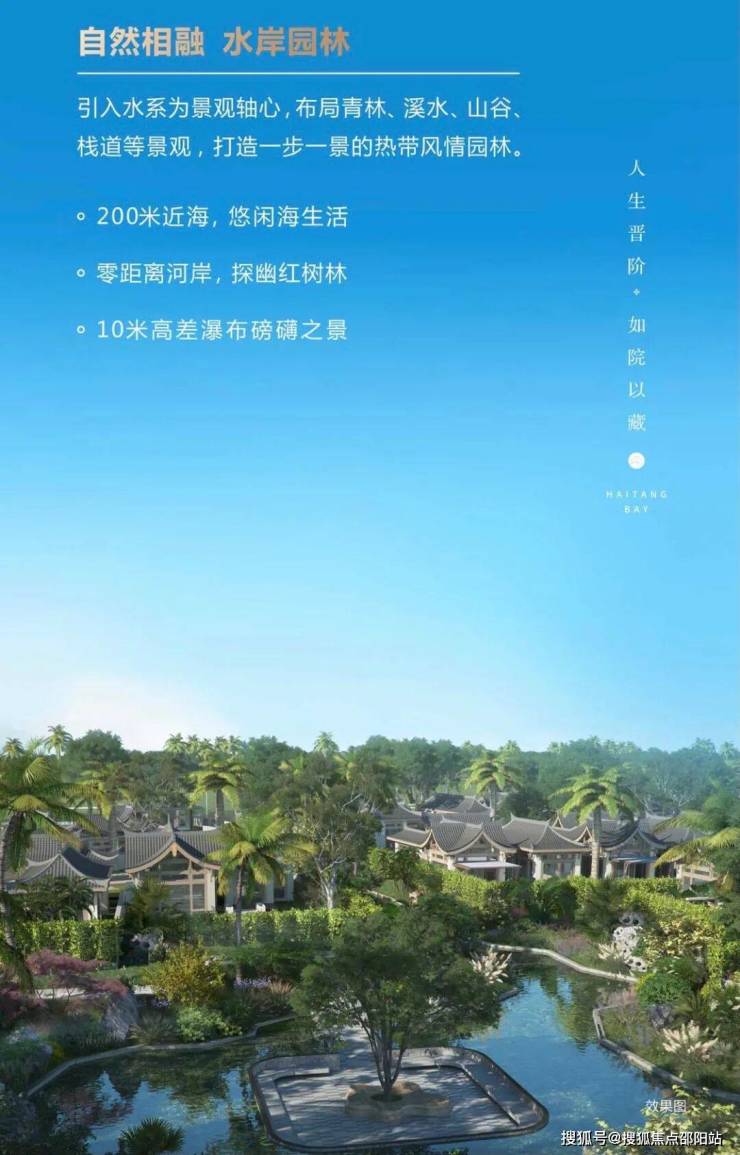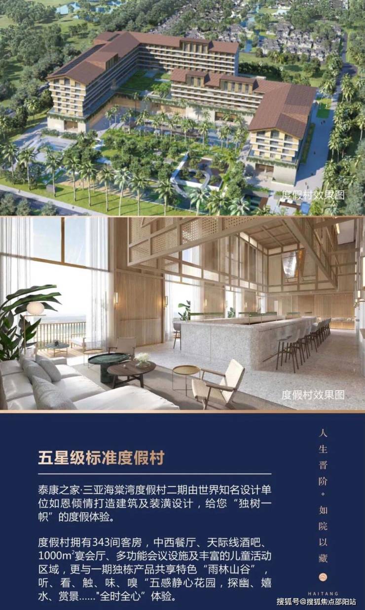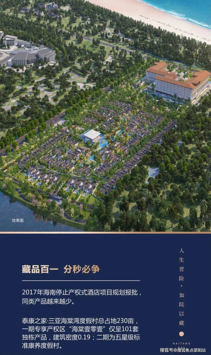 是泰康倾心打造的继泰康之家 CCRC 持续照护养老社区后的创新产品线,选址自然环境与未来发展俱佳的海棠湾一线,旨在满足全年龄段客户休闲度假、候鸟旅居、适老化等多元需求。分两期开:一期为专享产权区海棠壹零壹(101席中式独栋产品,建面约2万㎡,在售),二期为五星级标准康养度假村(建面约8万㎡,按五星级酒店标准投建)。