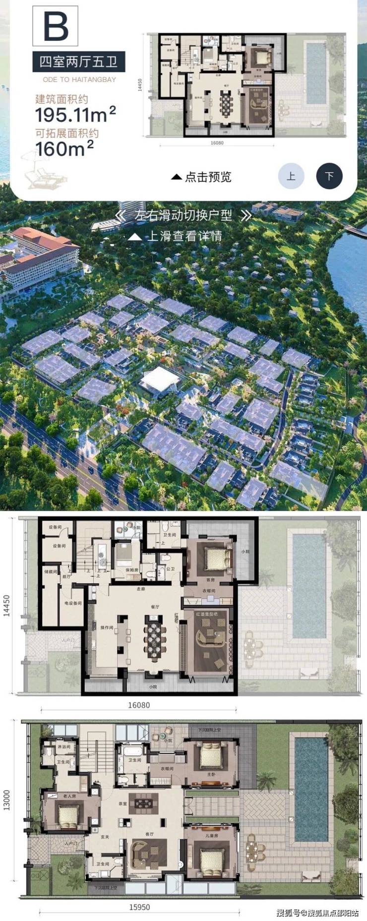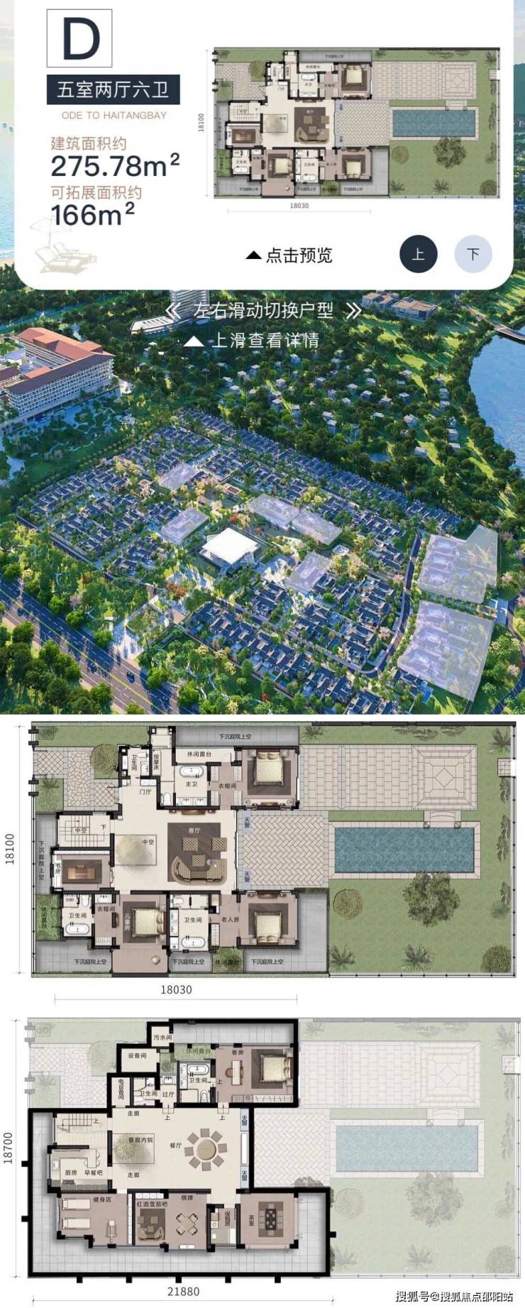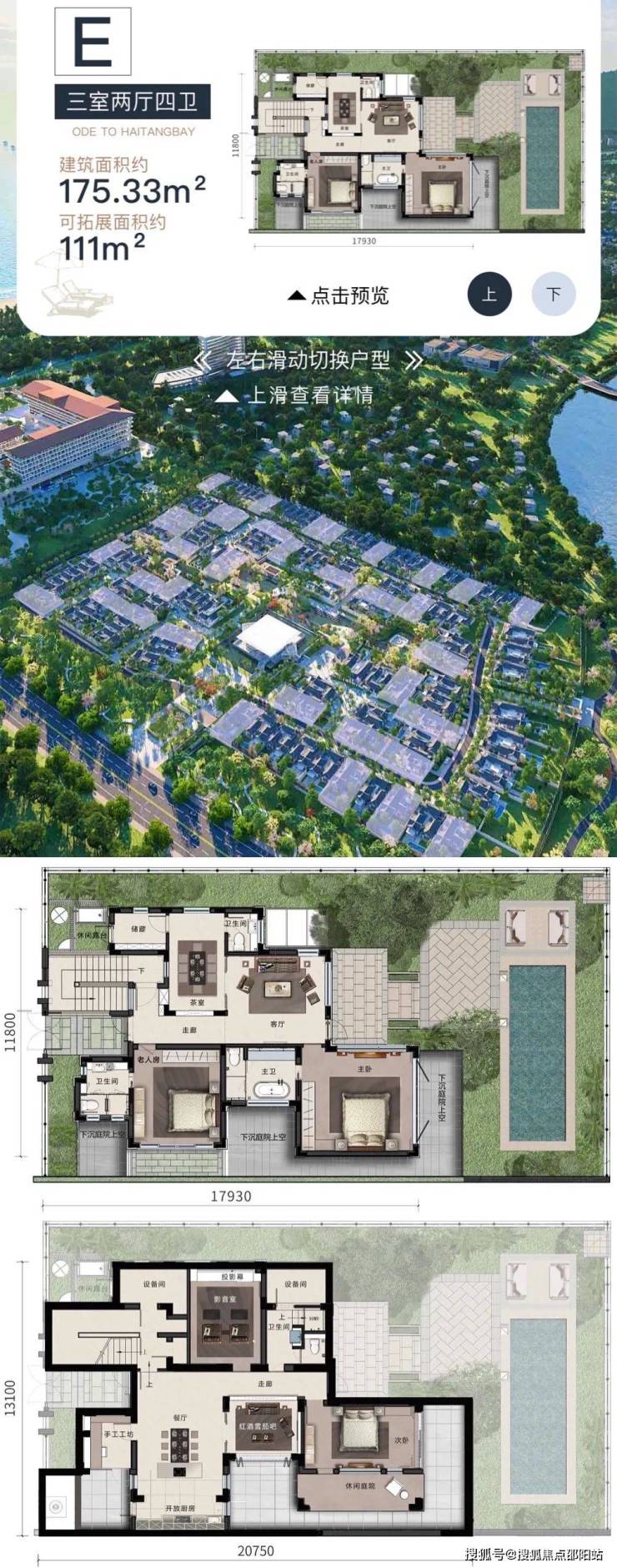 建筑面积175–275㎡,超大庭院(占地面积322–1366㎡),户户泳池,私家车位;敞阔两层户型设计,私享独院产品。