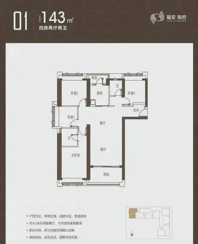 143㎡户型功能分区欠佳,不过三面采光较好。⚡⚡福安瑞府开发商电话:400-859-7606【☎☎开发商电话已认证】⚡✽✽✽✽